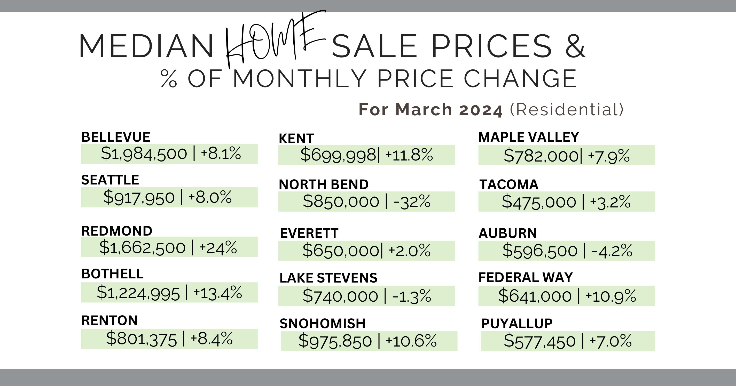 March 2024 Median Home Sales by City & % of Monthly Price Change